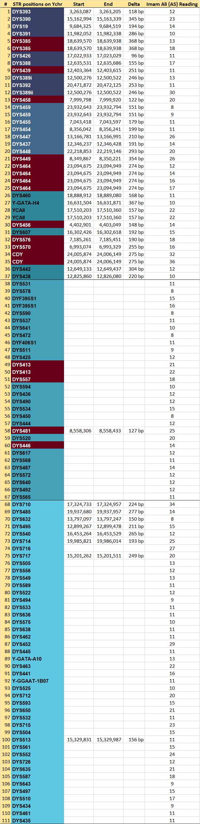 وهذه قائمة كاملة بمواقع 111 STRs على ChrY وقراءتها (لا زالت قيد التحديث):
