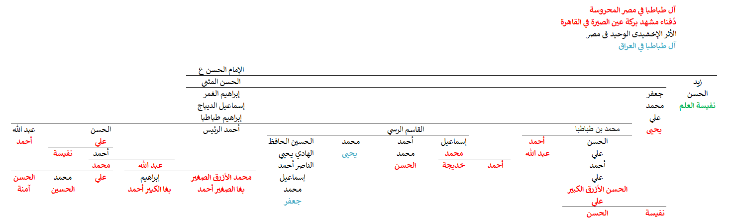 مُشجّر يُبرز أسماء آل طباطبا الذين سكنوا مصر المحروسة ودُفنوا فيها خلال القرنين الثالث والرابع الهجري (العهد الإخشيدي)، لا سيّما في المشهد الذي يُعرف اليوم ببِركة عين الصيرة – جنوب القاهرة.