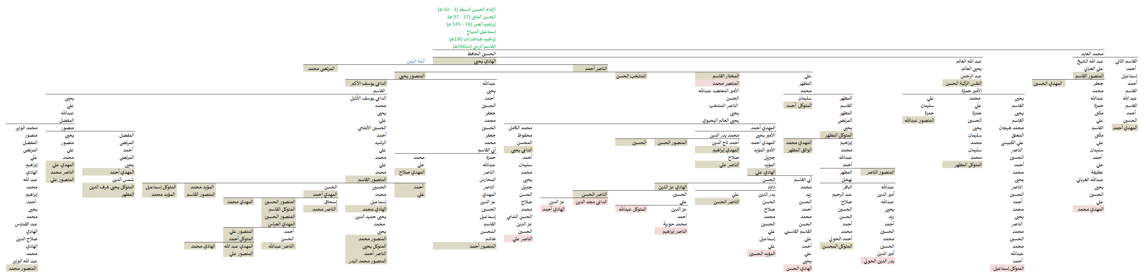 وهذا نسبهم: السيّد يحيى حميد الدّين بن محمد بن إسماعيل بن محمد بن الحسين بن المنصور القاسم بن محمد بن علي بن محمد بن علي بن الرشيد بن أحمد بن الحسين الأملحي بن علي بن يحيى بن محمد بن الداعي يوسف الأشلّ بن القاسم بن الداعي يوسف الأكبر بن المنصور يحيى بن الناصر أحمد بن الهادي يحيى بن الحسين الحافظ بن القاسم الرسّي بن إبراهيم طباطبا بن إسماعيل الديباج بن إبراهيم الغمر بن الحسن المثنى بن الإمام الحسن المُجتبى (ع).
