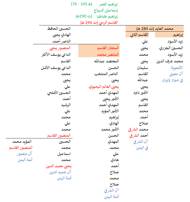 ويتوزع السادة الشرفي بين نسبين (كلاهما يرجع الى القاسم الرسّي)، تماماً كما يوضح المُشجّر المُرفق: