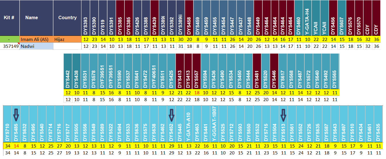 تمّ العثور على عيّنة قديمة للسادة آل الندوي اللكهنوي (من الهند) فاحصة للتحورات المتكرّرة 111 ومطابقة بشكل كبير للعيّنات القرشيّة والعلويّة (DYS485=14)، لا سيّما الحُسينيّة منها. مُبارك لهم.