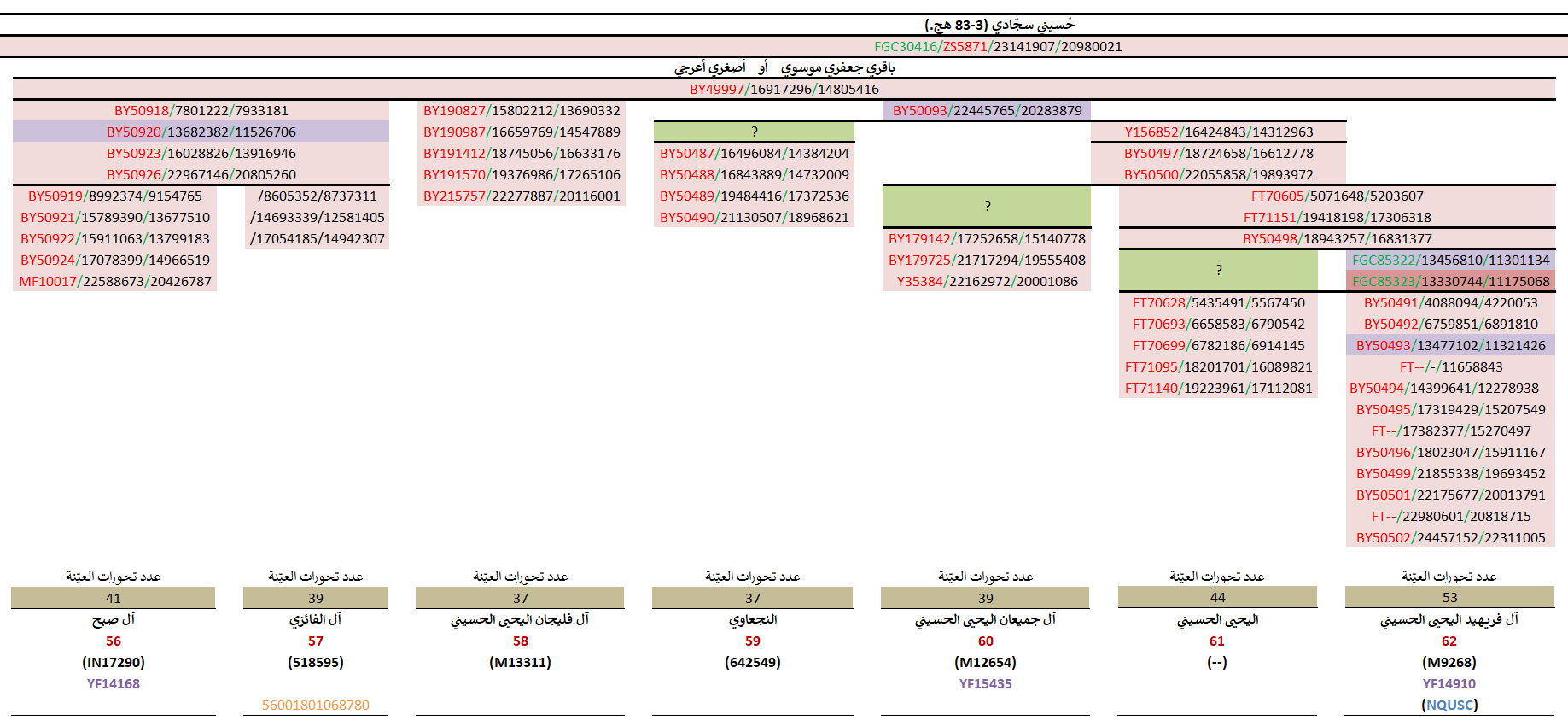 مواضيع مُتعلّقة: تحديث نتيجة السادة الفائزي ، نتيجة السادة آل قفطون الحُسيني ، السادة آل فائز ، السادة آل طعمة وآل نصرالله ، نتيجة السادة الفليجان الحسيني ، تحديث ثاني لعيّنة الحرموس الحسيني ، نتيجة السادة آل فريهيد BigY ، نتيجة السادة آل صبح BigY ، نتيجة السادة الجميعان BigY ، نتيجة آل النجعاوي BigY