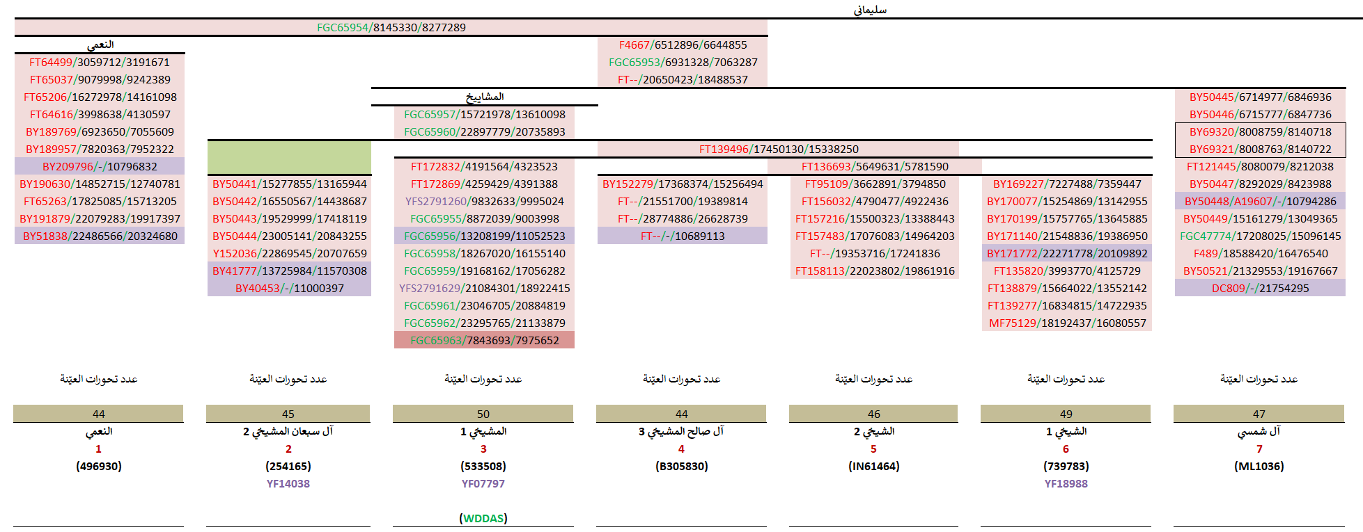 - للتحوّرين المشتركين (FT139496 و FT136693) بين عيّنتيّ آل الشيخي (1) وآل المشاييخ (2) المجاورتين لهم جُغرافيّاً، أسفل تحور الأشراف المشاييخ الجامع FGC65957.