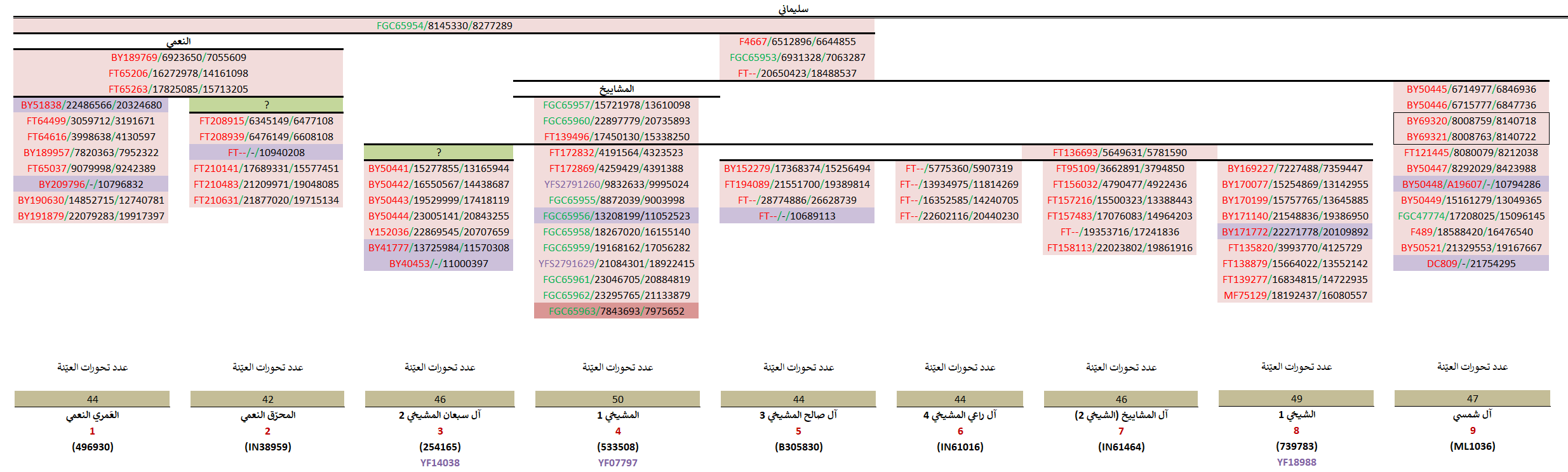 - للتحوّر FT136693، المشترك بين عيّنات آل الشيخي (1) وآل المشاييخ (2) وآل صالح المشيخي (3)، أسفل تحوّرات الأشراف المشاييخ الجامعة (FT139496 و FGC65957 و FGC65960).
