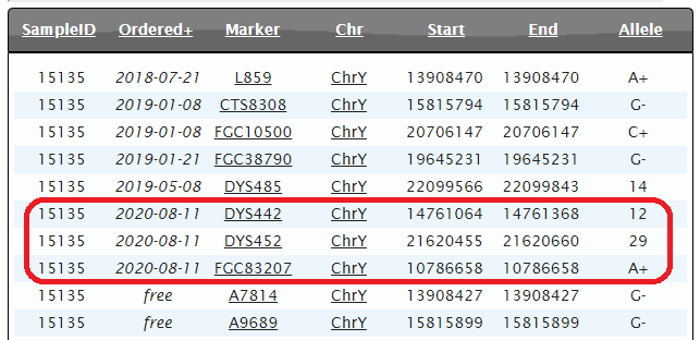 - سالبة للتحوّر المُتكرّر الصالحي DYS452=30 ولديها قراءة عامّة له (DYS452=29)، ممّا يجعل DYS452=30 خاص بالسيّد موسى الجون أو ابنه عبدالله الصالح.