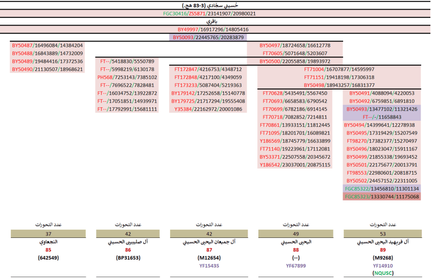 - موجبة للتحوّر الحُسيني الفرعي BY49997 المُشترك بين خطوط السادة اليحيا في الجهراء والسادة آل فائز في كربلاء وآل صبح في جبل عامل.