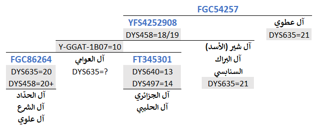 ويتوزّع الخطّ الحُسيني الموسوي الفرعي الضخم FGC54257 على تكتّلات جينيّة مُتعدّدة إضافيّة، نذكر منها تكتّلات السادة: