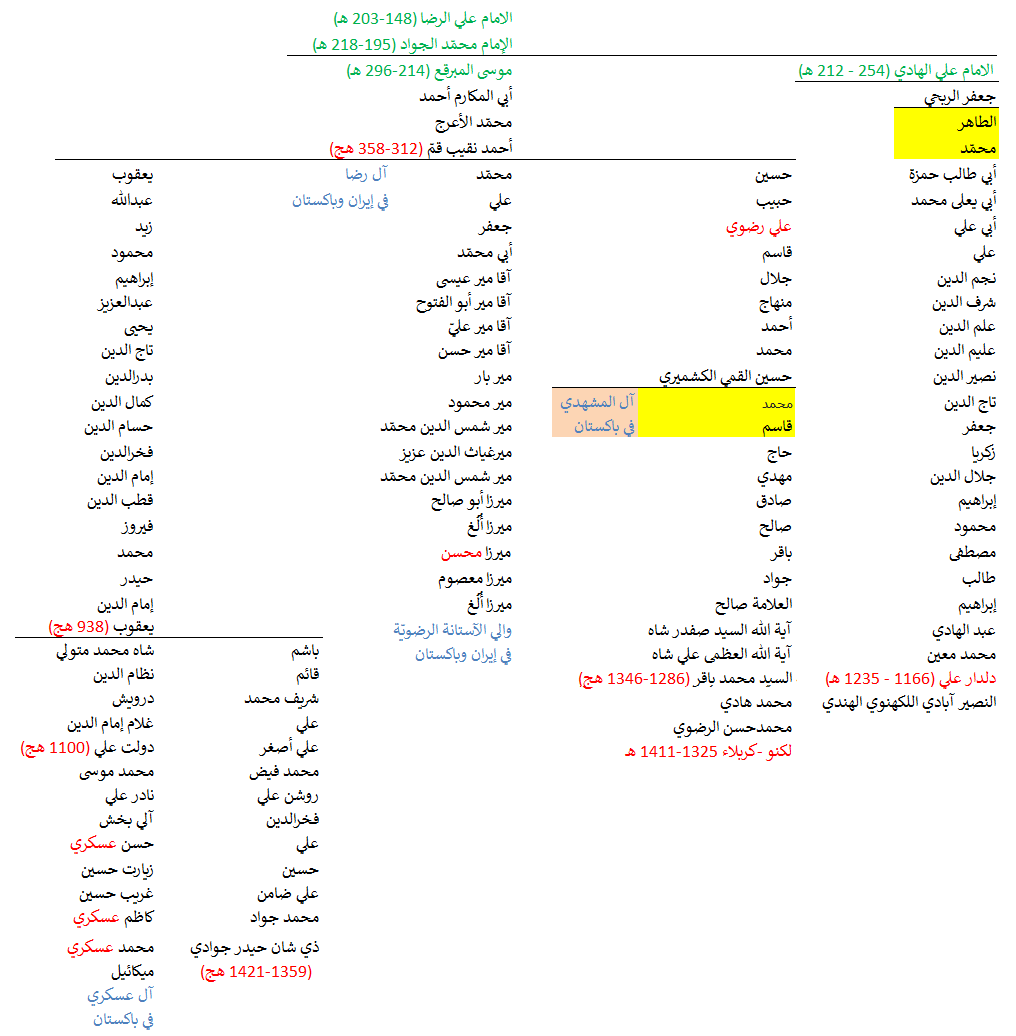 وهكذا بدا عامود نسبهم (المدوّن بشكل مُمنهج ولا يشوبه أيّ تعليق أو سقط بالأسماء) ضمن أعمدة نسب العيّنات الرضويّة ومشاهيرهم: