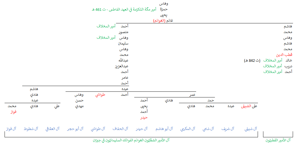 ويعود نسب السادة آل شبيلي آل الأمير الشطوط الغوانم إلى الشريف علي (الملقب بالشبيلي – وله النسبة) بن حمد بن عمر بن عبده بن أحمد (الجدّ الجامع لكافّة فروع الشطوط) بن عامر بن أحمد بن عبد العزيز بن عبدالله بن محمد بن وهاس بن سليمان بن وهاس (أمير المخلاف) بن منصور بن أحمد (أمير المخلاف) بن غانم (وله النسبة) بن يحيى بن حمزة (أمير مكّة المُكرّمة في العهد الفاطمي – ت 461 هـ) بن وهاس بن أبي الطيب داود (أمير مكّة المُكرّمة في العهد الفاطمي – ت 403 هـ) بن عبدالرحمن بن عبدالله أبي الفاتك (وله النسبة) بن داود بن سليمان الحرابي الزيدي (وله النسبة) بن عبد الله الصالح بن موسى الجون بن عبدالله المحض بن الحسن المثنى بن الإمام الحسن المجتبى (عليه السلام).