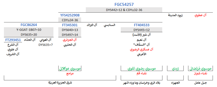 ويدعمُ فَصْلَ هذه العيّنات بين جيلين مختلفين، قراءةُ التحور المتكرّر لآل عطوي وزيود بني حسين ذو القيمة العامّة (CDY≅32-36)، بينما يتغيّر لاحقاً لدى الجزء الفرعي الموجب للتحوّر YFS425908 (آل البراك والسنابسي والرضويين وغيرهم) إلى قراءة جديدة (CDY≅34-36). وهكذا بدا هذا الفصل بين الجيلين على الصعيد العائلي والجيني (SNPs & STRs):