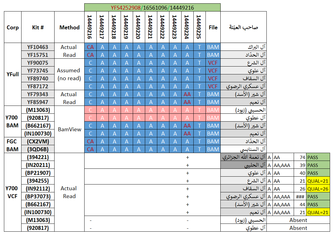 وجاءت قراءة التحوّر YFS425908 (وهو تحوّر من نوع INDEL، على قراءة C>CA عبر Long Read) قويّة ومفصليّة بين عيّنات آل عطوي وزيود بني حسين السالبة له من جهة، وعيّنات شرق الجزيرة وبلاد الريّ وخراسان وبلاد ما وراء النهر (باكستان وشمال الهند) الموجبة له من جهة ثانية، على الشكل التالي:
