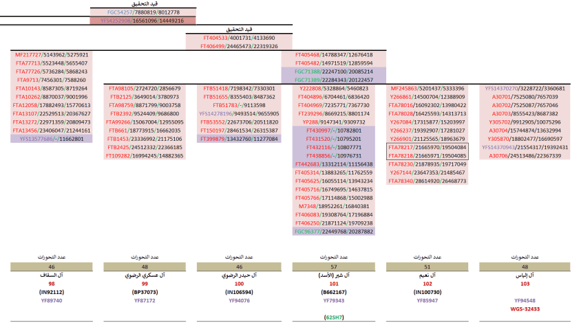 - موجبة للتحوّر المُشترك YFS4252908 الجامع لها مع عيّنات ساوى-شمال الهند وشرق الجزيرة العربيّة والبصرة (والسالب لعيّنة بني حسين الجهراء وآل عطوي).