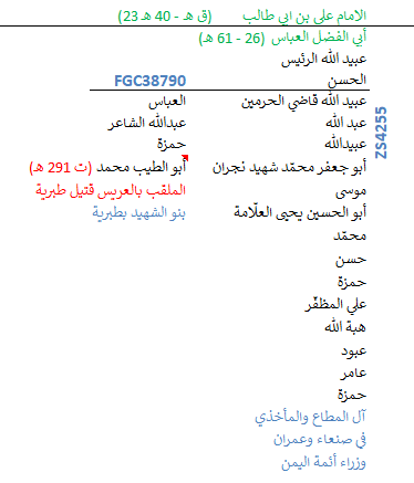 وبحسب كتاب “المعقبون من آل أبي طالب” للسيّد يحيى النسّابة العقيقي، فإنّ ذريّة أبي الفضل العبّاس (شهيد وقائد معركة كربلاء) انحصرت في وَلَدِه عبيدالله بن العبّاس وأحفاده الستّة. وكان قد عمِل الإمام علي زين العابدين (ع) جاهداً في تزويجهم من بنات ذراري عبدالمطلب حتّى لا تنقطع ذُريّة عمّه العباس (ع) إكراماً لما قدّمه من تضحيات أمام أخيه الإمام الحُسين الشهيد (ع) في كربلاء. وهذا مُلخّص توضيحي لعَقِب هذه الأسرة العلويّة الهاشميّة الكريمة: