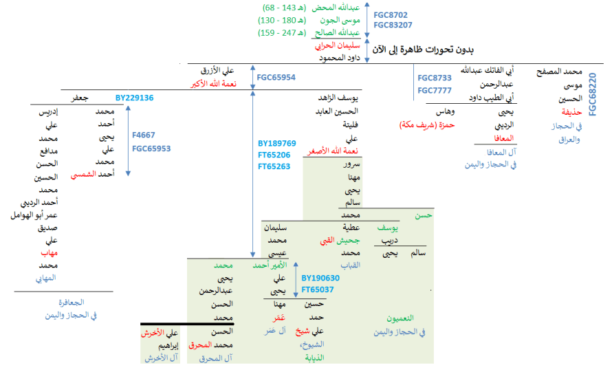 وهذا مُشجّر يوضح أبرز أعمدة نسب السادة النعميّين (بخطّيه الجعفري والنعمي الأصغر -كلاهما قيد التدقيق لمواقع التحورات-):