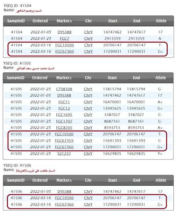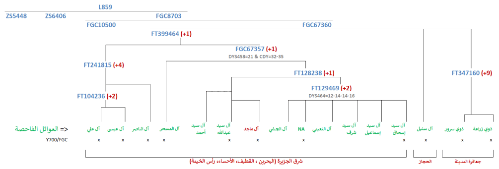 مواضيع مُتعلّقة: نتيجة Y700 لجعافرة المدينة الأشراف ، نتيجة السادة ذوي سرور الجعافرة Y700 ، نتيجة الأشراف آل سنبل Y700 ، نتيجة Y700 لآل الناصر “الجعافرة” ، تحديث نتيجة آل عيسى عبدالله Y700 ، تحديث نتيجتي آل علي وسنبل ، نتيجة FGC للسادة المُسَحِّر ، نتيجة آل سيّد ماجد البحراني Y700 ، نتيجة آل سيّد عبدالله البلادي Y700 ، نتيجة السادة آل سيد أحمد ، نتائج جديدة لعيّنات طالبيّة ، نتيجة السادة آل النعيمي ، نتيجة آل سيّد إسحاق البلادي Y700 ، نتيجة عيّنة آل الجشّي ، نتيجة السادة آل إسماعيل ، نتيجة عينة آل حسين شواهد الجعافرة التاريخية ، الآباء الطالبيون، تحوراتهم وخصائصهم ، التحور الطالبي الهاشمي