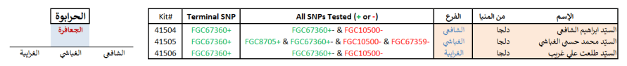 - تمّ تطوير عيّنة الشافعي لفحص WGS400 حتى يتبيّن الإلتقاء الجيني الصحيح مع الفروع الجعفرية في الحجاز (لا سيما ذوي ماجد بالمدينة المنوّرة وآل سنبل في مكة المكرمة).