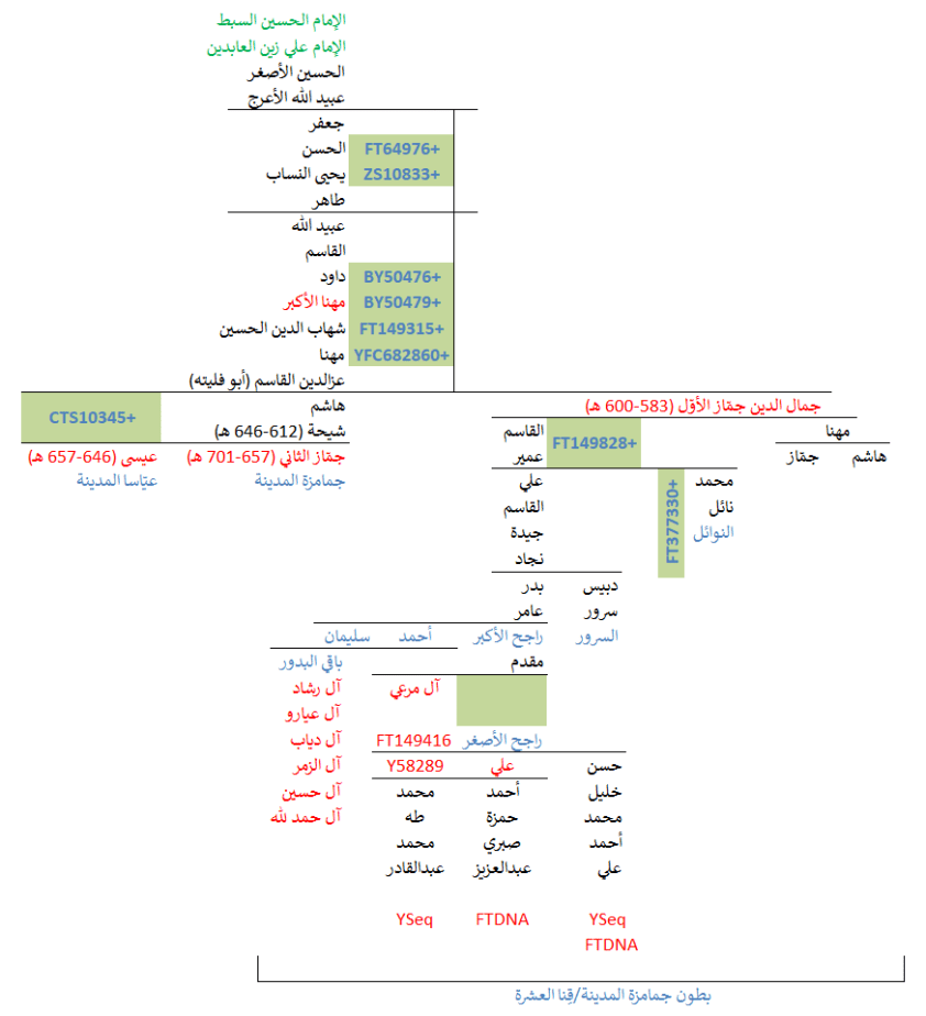مواضيع مُتعلّقة: نتيجة آل راجح الجمامزة Y700 ، تحديث عيّنة آل مرعي الجمامزة ، 12 عيّنة للسادة النوائل الجمامزة الأعرجيّة ، نتيجة السادة النوائل الجمامزة Y700 ، نتيجة السادة آل عليوة الجمازي Y700 ، نتيجة Y700 للسادة آل خضران الشريف ، نتيجة السادة الخدعان الحُسيني Y700 ، نتيجة السادة آل عميرة ، نتيجة آل بركة العيّاسا Y700 ، نتيجة آل شقيران العيّاسا ، نتيجة السادة آل الجمّاز Y700 ، نتيجة آل شربجي الجمامزة Y700 ، نتيجة السادة آل غزالي Y700 ، نتيجة السادة آل شُبّر الحسيني Y700 ، نتيجة السادة الفحّام BigY ، نتيجة السادة العرفات Y700 ، نتيجة Y700 للسادة آل الحُسيني ، الDNA أصدقُ إنباءً من الكُتبِ ، السادة الأعرجيّة وتاريخ المدينة الضائع ، نقش أولاد طاهر في المدينة ، Güemes = جمّاز؟
