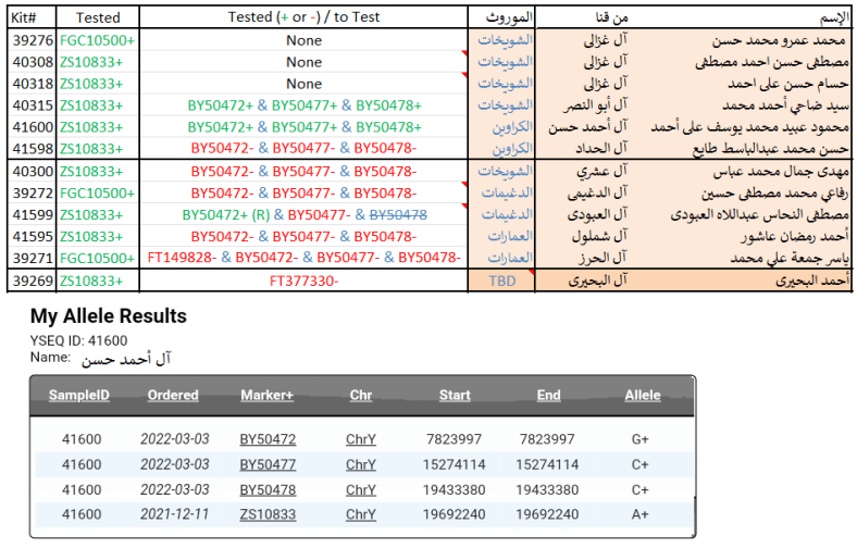 وهذه قائمة بالعيّنات الفاحصة وأرقامها ونتائجها وتوزيعها الجغرافي (ثلاثة منها ترجع لآل غزالي ولهم عيّنة Y700 قديمة):