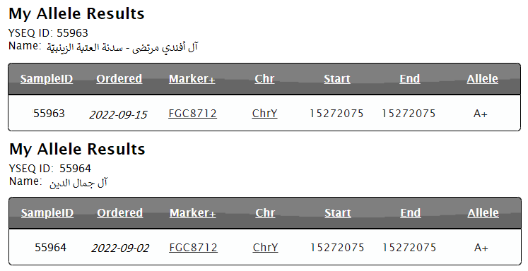 وهذه قائمة بنتائج العيّنات الفاحصة وأرقامها (ولهم عيّنات إضافيّة لفرعهم -آل مرتضى الشامي- Y700 من العام الماضي):