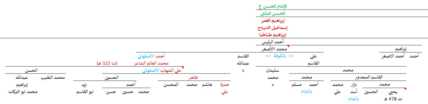 ويعتمد كتاب تهذيب الأنساب (للعلامّة العبيدلي) على أعمدة نسب للسادة “الرئيسيّة” مُتماثلة بأسمائها مع مواريث هذه الأسر الكريمة، وقد جاءت متوالية على الشكل التالي: