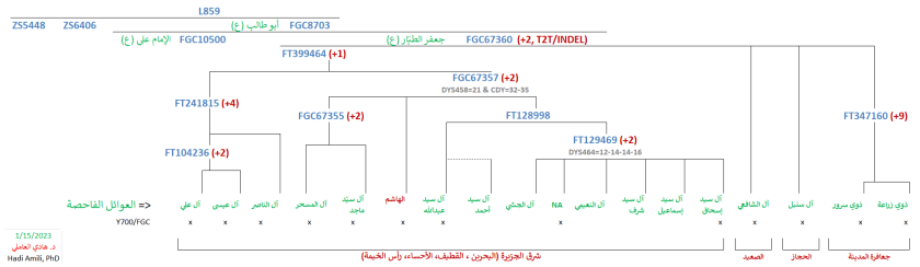 وأصبحت نتيجة السادة آل الشافعي تتمركز مع أبناء التكتّل FGC76360 في المُشجر الجينو-تراثي الطالبي على النحو التالي: