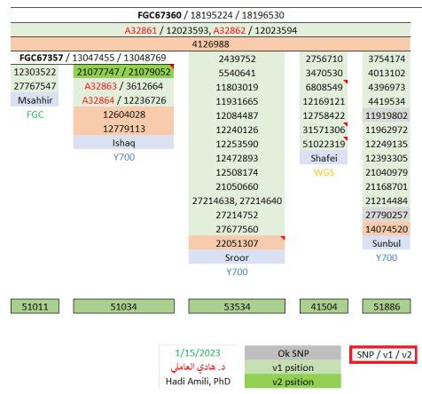 - عِدّة تحوّرات INDEL جديدة خاصّة بالسادة ذوي سرور وآل سنبل وآل سيّد إسحاق (باللون البرتقالي).