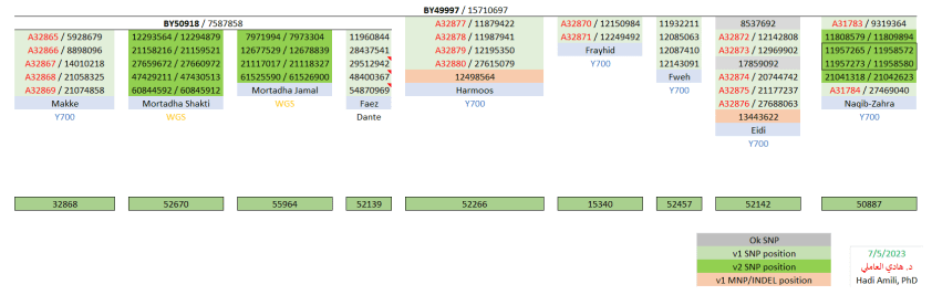 مواضيع مُتعلّقة: نتيجة WGS للسادة آل مرتضى الشقطي ، تحديث عيّنات السادة آل مرتضى الحُسيني ، نتيجة السادة آل مرتضى الشامي Y700 ، عيّنات السادة آل مرتضى وآل جمال الدين الحُسيني ، نتيجة السادة آل صبح BigY ، نتيجة السادة آل مكّة الحُسيني Y700 ، نتيجة السادة آل خلف العاملي Y700 ، نتيجة السادة آل نصرالله Y700 ، نتيجة السادة آل فائز الحُسيني WGS ، نتيجة السادة آل قفطون الحُسيني ، السادة آل فائز ، السادة آل طعمة وآل نصرالله ، تحديث نتائج السادة آل زهرة الحُسينيّين ، ستة نتائج لخط السادة آل زهرة ، تحديث نتائج النقباء آل زهرة الجعافرة ، عيّنات النقباء آل زهرة الإسحاقيين الجعافرة ، نتيجة آل موسى النقيب الزُهري الجعفري Y700 ، نتيجة آل حسّون صلاح الزُهري الجعفري Y700 ، نتيجة آل محي الدين الزُهري الجعفري Y700 ، عيّنة السادة الغرابان الحُسيني Y700 ، نتيجة السادة آل فريهيد Y700 ، نتيجة السادة الجميعان BigY ، نتيجة السادة الفويه الحُسيني Y700 ، نتيجة الفليجان والحرموس Y700 ، نتيجة السادة الصُليبي الحُسيني Y700 ، نتيجة السادة الكويم العيدي الحُسيني Y700 ، نتيجة السادة القبيه الحُسيني Y700 ، نتيجة آل النجعاوي BigY ، زهرة المقول وفروع بني حسين