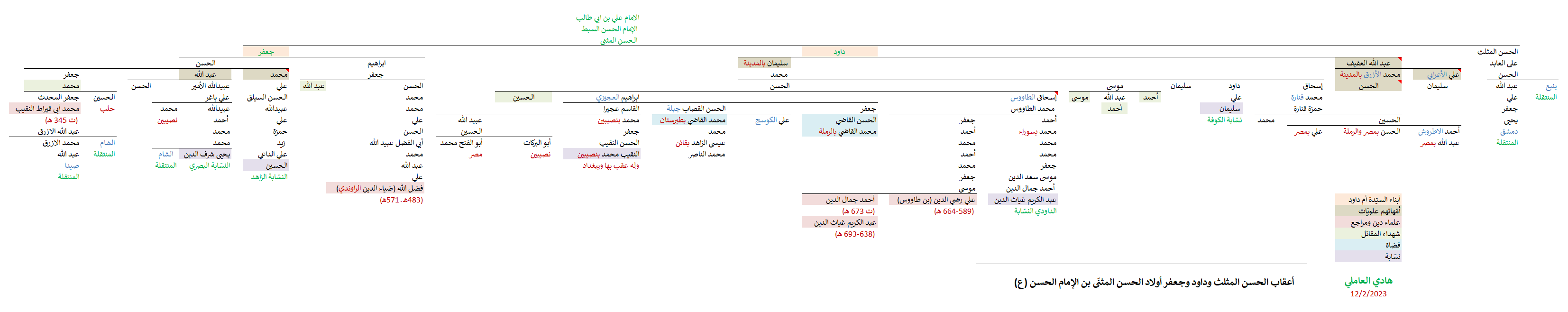 وقد برز عدّة مشاهير وشخصيّات عُلمائيّة وشهداء (وفق كتاب المقاتل) وقضاة ونسّابة من ذراري الحسن المُثّلث وداود وجعفر أولاد الحسن المثنّى (رضوان الله عليهم)، نعرض لكم أسماءهم ونسبهم وجغرافيّتهم في هذا المُشجّر مِمّن نزل حلب ونصيبين والشام (حيث يحتمل البعض منهم أن يكون من آباء تلك العوائل الحسنيّة الحديثة):