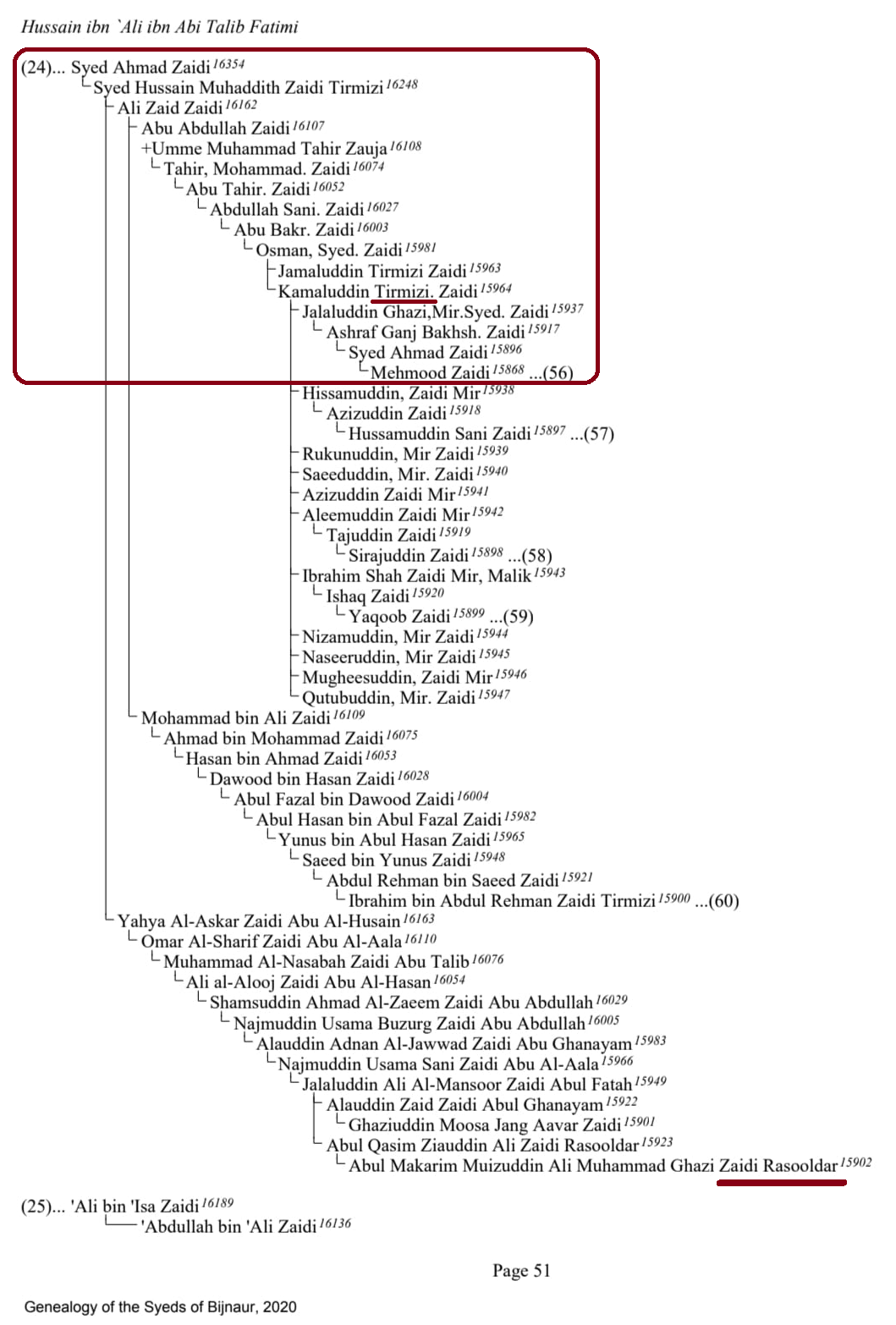 وينتهي نسب السادة آل حسين إلى السيد غلام حسين بن بخش بخشيش علي بن غلام مصطفى بن غلام مرتضى بن أحمد كبير بن علي أكبر بن علي بن الله بخش بن محمد بن مظفّر علي بن سراج الدين (سيد راجو) بن حسن نهتوري بن ضياء الدين بن حسن عسكري بن محمود الترمذي الذي ينتهي موروثه إلى السيد زيد الشديد بن أبي عبدالله الحسين النسابة بن أحمد المحدث بن أبي علي عمر بن أبي الحسن يحيى المحدث بن الحسين ذي الدمعة بن الفقيه زيد الشهيد بن الإمام علي زين العابدين (عليه السلام). وقد تمّ جمع هذا العامود النسبي حديثاً وتشوبه عدّة أخطاء.