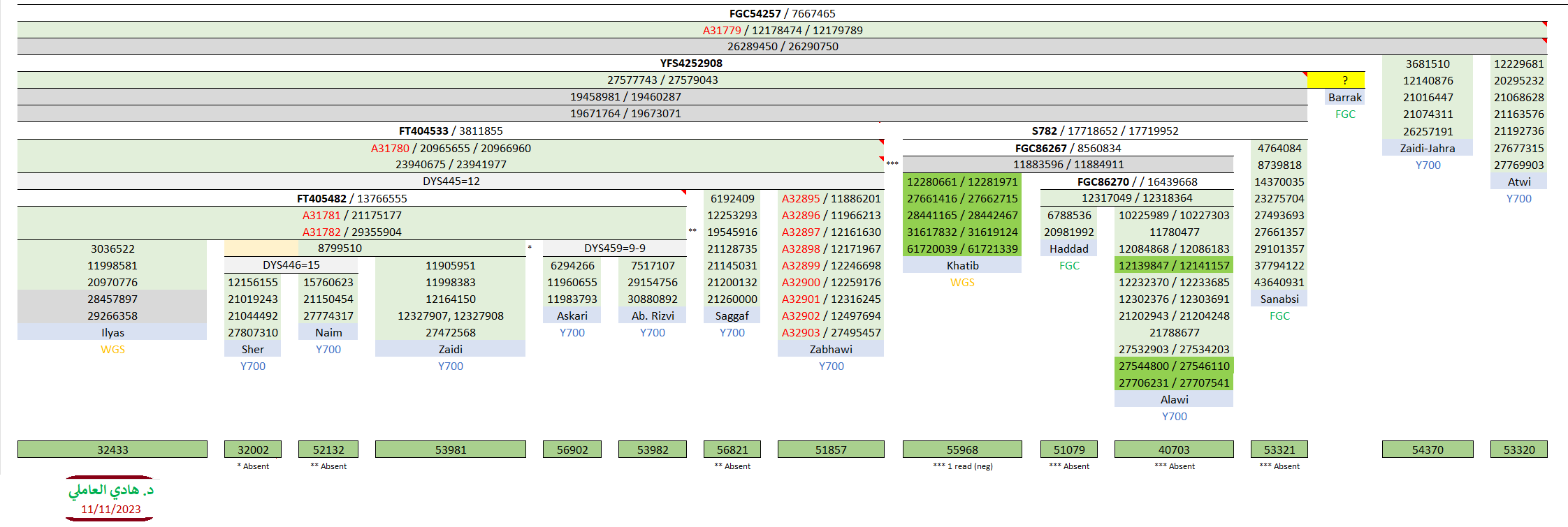 مواضيع مُتعلّقة: نتيجة السادة آل حسين الحُسيني ، عيّنة السادة “السقاف” Y700 ، نتيجة السادة آل عباس الرضوي Y700 ، نتيجة السادة آل عسكري الرضوي Y700 ، نتيجة السادة آل حيدر الرضوي Y700 ، نتيجة Y700 ثانية للسادة آل شير الأسد ، نتيجة السادة آل شير الأسد Y700 ، نتيجة السادة آل نعيم الموسوي Y700 ، نتيجة السادة آل إلياس الحُسيني WGS ، نتيجة السادة آل الزيدي الحُسيني Y700 ، عيّنة السادة الندوي ، نتيجة السادة الذبحاوي الحُسيني Y700 ، تحديث ثاني للسادة آل صالح الحُسيني ، نتيجة السادة آل نورالدين الحُسيني Y700 ، نتيجة WGS لعيّنة السادة آل الخطيب ، نتائج عيّنات السادة آل مرتضى وآل الخطيب ، نتيجة WGS للعيّنة الأكاديميّة FGC54257 ، نتيجة السادة آل العلويات الحُسيني Y700 ، نتيجة السادة آل الحدّاد FGC ، نتيجة السادة آل المُقبّل الحُسيني Y700 ، نتيجة السادة آل الشرع الموسوي Y700 ، نتيجة السادة آل العلوي Y700 ، نتيجة السادة آل الشريف الحُسيني Y700 ، عيّنة السادة آل حمزة الحُسيني ، عيّنة السادة آل سيد إبراهيم الحُسيني، نتيجة السادة آل مرزوق الحُسيني ، نتيجة السادة الحُليبي الموسوي Y700 ، نتيجة السادة آل الجزائري الموسوي Y700 ، تحديث نتيجة آل البراك ، نتيجة السادة آل عطوي الموسوي Y700 ، نتيجة السادة “الزيود” من بني حسين Y700 ، تحديث هيكليّة فروع FGC54257