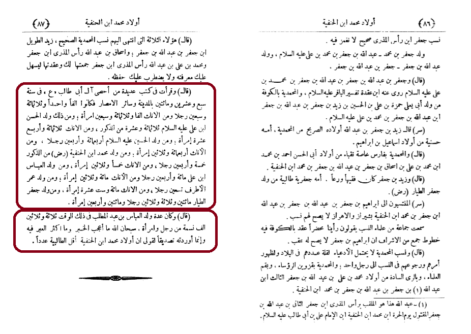 ورد في كتاب “سرّ السلسلة العلويّة” للعلّامة أبي نصر سهل بن عبد الله بن داود بن سليمان بن أبان البخاري، المتوفى سنة 357 هج ببغداد والناقل عن جماعة من المؤرخين والنسّابين العلويّين والطالبيّين وغيرهم، إحصائيّة هامّة ونادرة جدّاً لأعداد الطالبيّين الذين عاشوا في المدينة النبويّة المُشرّفة ومختلف الأمصار الإسلاميّة خلال العام 227 هج. وقد أبرزت هذه الإحصائيّة أن عدد الرجال والنساء الأحياء المُنحدرين من ذريّة أبي طالب (ع) قد بلغ 2740 شخصاً في تلك السنة وهم موزّعون على مختلف الفروع الحسنيّة والحُسينيّة والحنفيّة والعبّاسية-العلويّة والأطرفيّة والجعفريّة والعقيليّة. وقد تساوت أعداد الذكور والإناث من الطالبيّين في تلك الفترة وهي ظاهرة طبيعية للمُكوّنات البشريّة والمخلوقات البيولوجيّة عبر العصور والأزمنة (أي تَسَاوي مُعدّل الذكور والإناث). كما بدا في هذا التعداد التاريخي أنّ الأعقاب الحسنيّة والحُسينيّة والجعفريّة تشكّل حوالي 73% من الذريّة الطالبيّة الكريمة وفيها الكثرة والعدد، ويقابلهم القلّة في العدد لذريّة ابن الحنفيّة التي لا تتجاوز 3% وهي أقلّ الطالبيّة عدداً.