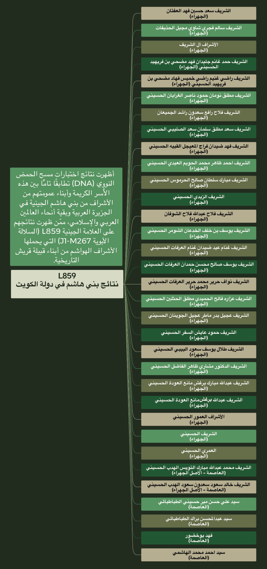 مسح إحصائي يكشف عن 47 نتيجة Y-DNA لعوائل هاشميّة علويّة من الكويت وبادية نجد على العلامة الجينية L859 التي يحملها أبناء قبيلة قريش من بني هاشم.