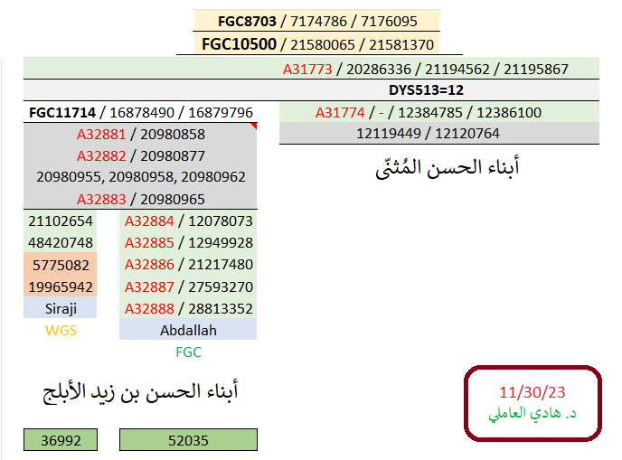 - موجبة للتحوّر الزيدي الحسني FGC11714 الجامع والمُشترك مع السادة آل سراجي والديلمي الحسني وآل أبي ذرّ وآل أحمد العبدالله.