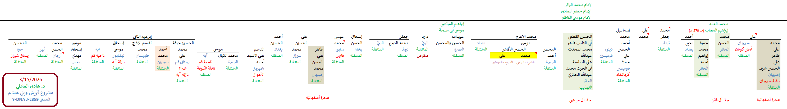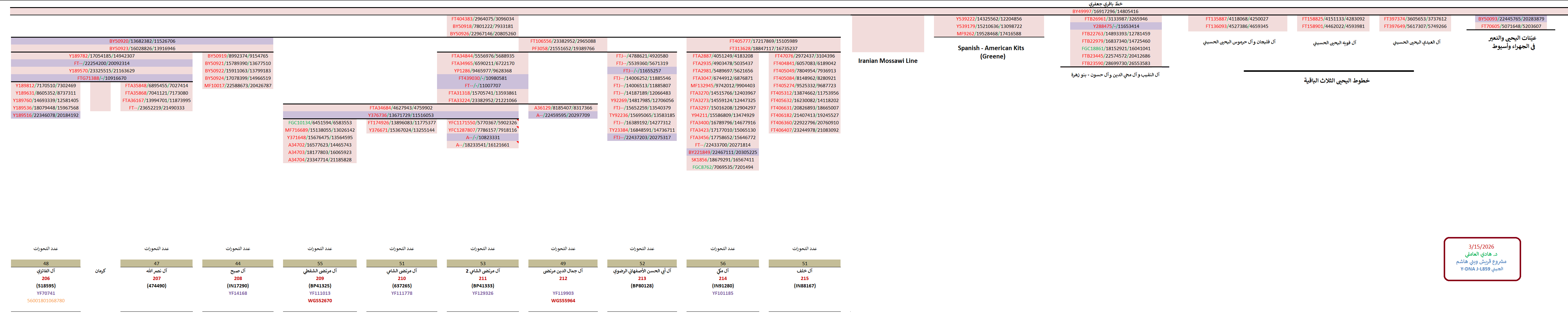 مواضيع مُتعلّقة: نتيجة WGS للسادة آل جمال الدين مرتضى ، نتيجة WGS للسادة آل مرتضى الشقطي ، تحديث عيّنات السادة آل مرتضى الحُسيني ، نتيجة السادة آل مرتضى الشامي Y700 ، عيّنات السادة آل مرتضى وآل جمال الدين الحُسيني ، نتائج السادة آل فحص الموسويّين في جبل عامل ، نتيجة السادة آل صبح BigY ، نتيجة السادة آل مكّة الحُسيني Y700 ، نتيجة السادة آل خلف العاملي Y700 ، نتيجة السادة آل نصرالله Y700 ، نتيجة السادة آل فائز الحُسيني WGS ، نتيجة السادة آل قفطون الحُسيني ، السادة آل فائز ، السادة آل طعمة وآل نصرالله ، قوّة عامود نسب السادة آل فائز الحسيني ، تحديث نتائج السادة آل زهرة الحُسينيّين ، ستة نتائج لخط السادة آل زهرة ، تحديث نتائج النقباء آل زهرة الجعافرة ، عيّنات النقباء آل زهرة الإسحاقيين الجعافرة ، نتيجة آل موسى النقيب الزُهري الجعفري Y700 ، نتيجة آل حسّون صلاح الزُهري الجعفري Y700 ، نتيجة آل محي الدين الزُهري الجعفري Y700 ، نتيجة السادة آل قنديل آل بهاء الدين النعير WGS ، نتيجة آل النجعاوي BigY ، عيّنة السادة الغرابان الحُسيني Y700 ، نتيجة السادة آل فريهيد Y700 ، نتيجة السادة الجميعان BigY ، نتيجة السادة الصُليبي الحُسيني Y700 ، نتيجة السادة القبيه الحُسيني Y700 ، نتيجة السادة الفويه الحُسيني Y700 ، نتيجة الفليجان والحرموس Y700 ، نتيجة السادة الكويم العيدي الحُسيني Y700 ، التكتّل الجعفري الجيني الثامن تحت BY49997 ، نتائج Y700 و WGS حُسينيّة تحت BY49997 ، شواهد الجعفريّين الحُسينيّين التاريخية في مصر ، أنا جعفر بن محمد ، منتقلة الجعفريّين الحُسينيّين – خرائط ومشجرات وآثار ، منتقلة السادة الموسويّة – خرائط ومشجرات وآثار ، زهرة المقول وفروع بني حسين