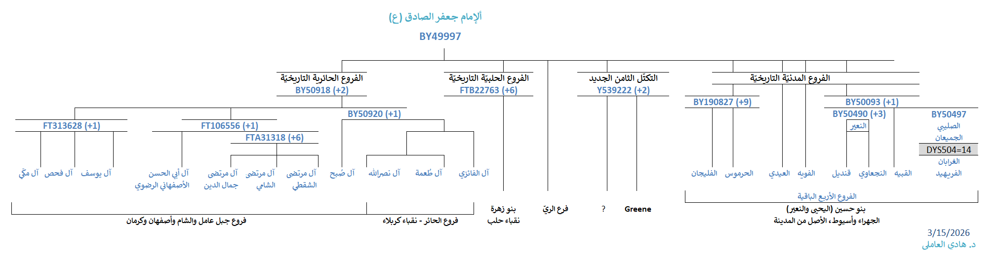 وبحسب كتاب “المعقبون” للسيّد يحيى النسّابة الحُسيني، فإنّ ذريّة الإمام الصادق –ع– تفرّعت في أبنائه الخمسة وأحفاده ال28، ممّا يجعل أعداد الخطوط الجعفريّة الجينيّة أسفل BY49997 تصاعديّاً وقد يزيد عن عشرين خطّ في المُستقبل (ما لم يظهر تحوّرات خاصّة بأبنائه). وهذا مُلخّص توضيحي لأبرز فروع العوائل العلويّة الجعفريّة الكريمة الموجودة لدينا في المشروع: