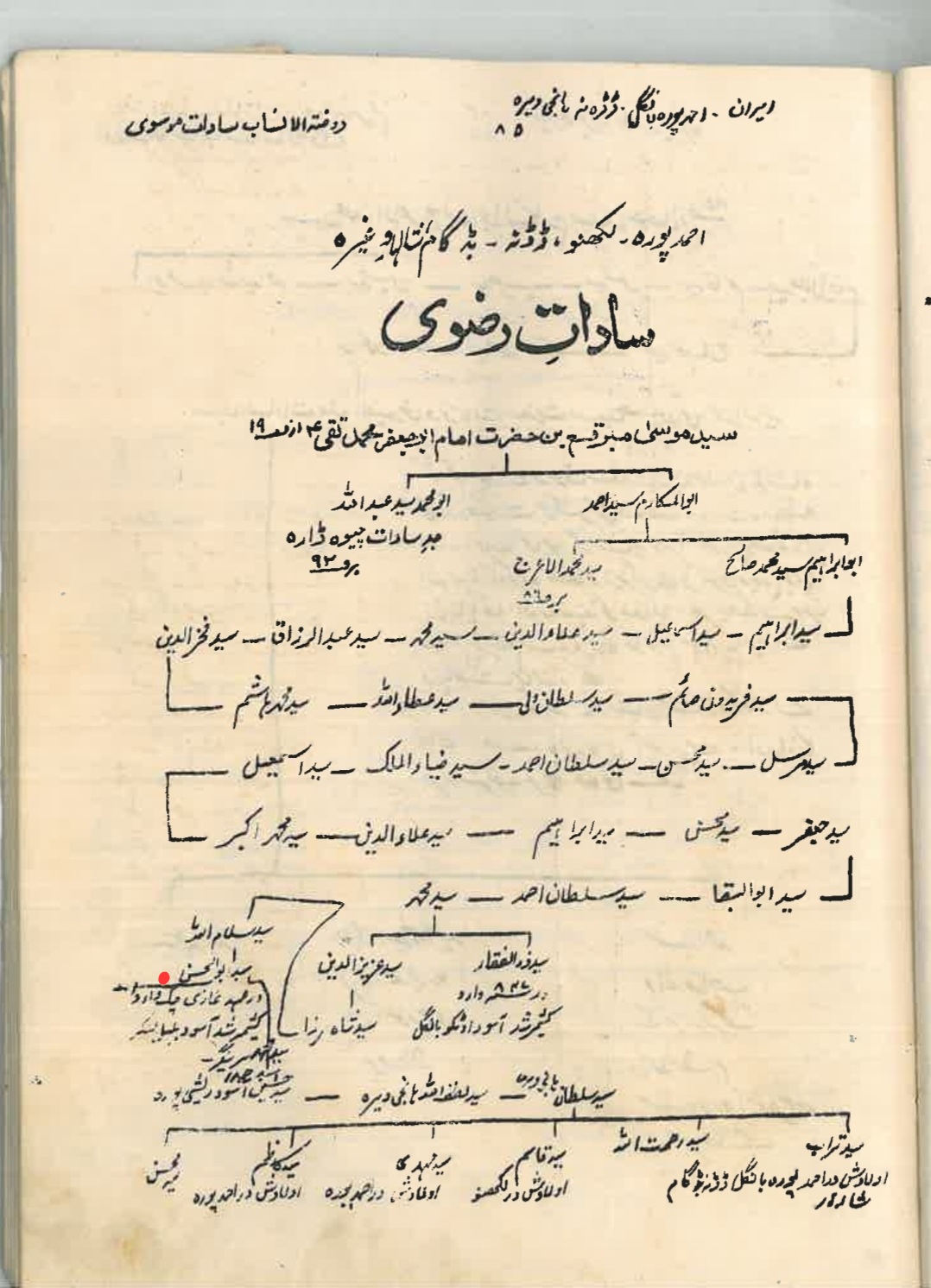 ويعود نسب السادة آل Razavi الحُسيني إلى جدّهم السيد العلّامة أبوالحسن الأصفهاني (من أعلام القرن العاشر الهجري – ت 975 هج) المنتقل من إصفهان إلى كشمير (Srinagar) للخدمة الدينيّة عام 935 هج، والذي ينتهي نسبه إلى الإمام علي بن موسى الرضا –ع– (بخلاف نتيجتهم الموسويّة الجينيّة). وتبدو رواية انتقاله من إصفهان إلى كشمير صحيحة كون البعض من ذراري السيّدين موسى أبي سبحة بن إبراهيم المرتضى (الذي ينتهي إليه نسب السادة آل مرتضى في الشام وكربلاء وجبل عامل) وإبراهيم المجاب بن محمّد العابد (الذي ينتهي إليه نسب السادة آل فائز وآل نصرالله في كربلاء وجبل عامل) قد انتقلوا إلى أصفهان (و سيرجان، كرمان).