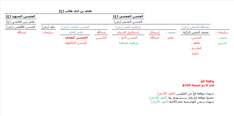 2) مشجر يوضح أسماء العلويين الذين استشهدوا في موقعة فخّ عام 169 ﻫ: