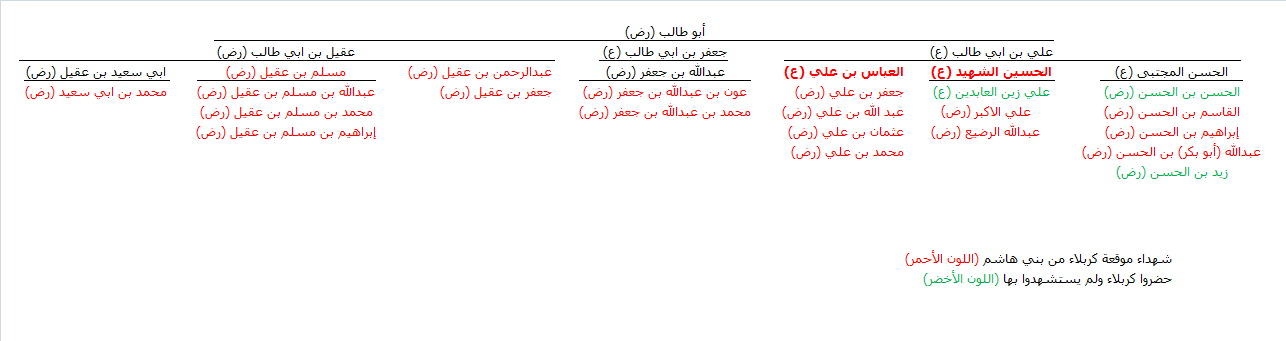 1) مشجر يوضح أسماء الطالبيين والعلويين الذين استشهدوا في واقعة كربلاء عام 61 ﻫ: