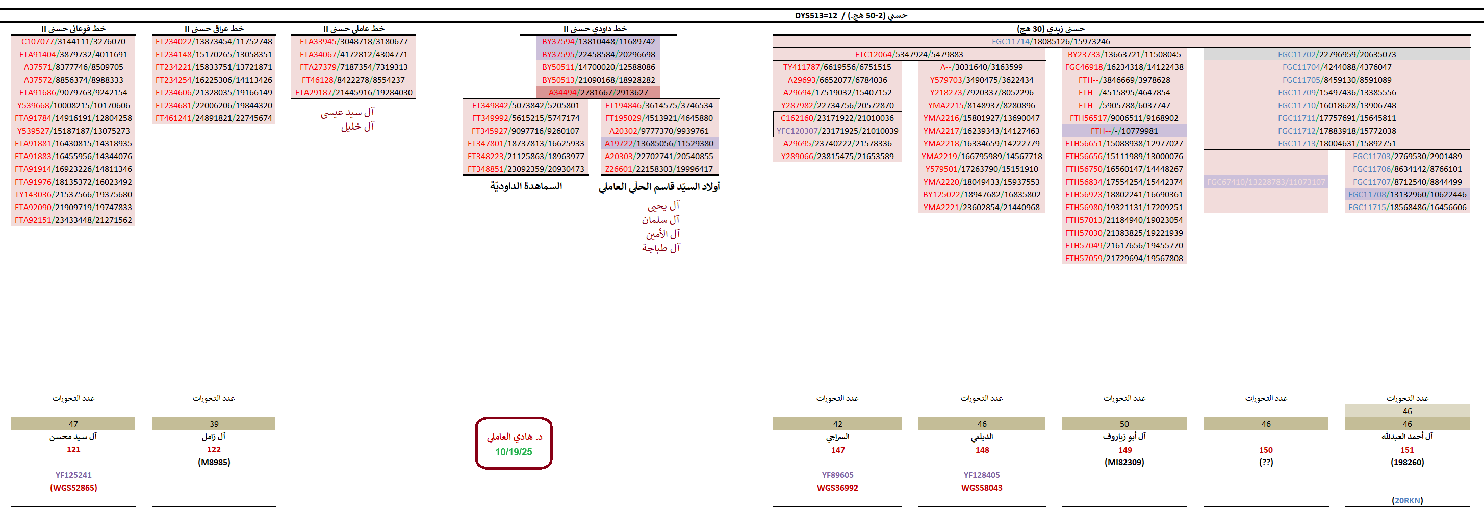 - موجبة للتحوّرات المشتركة الخاصّة بالسادة آل مهنّا كافّة (BY50476 و BY50479 و FT149315 و FTB20991 و DYS570=15 و DYS561=14).