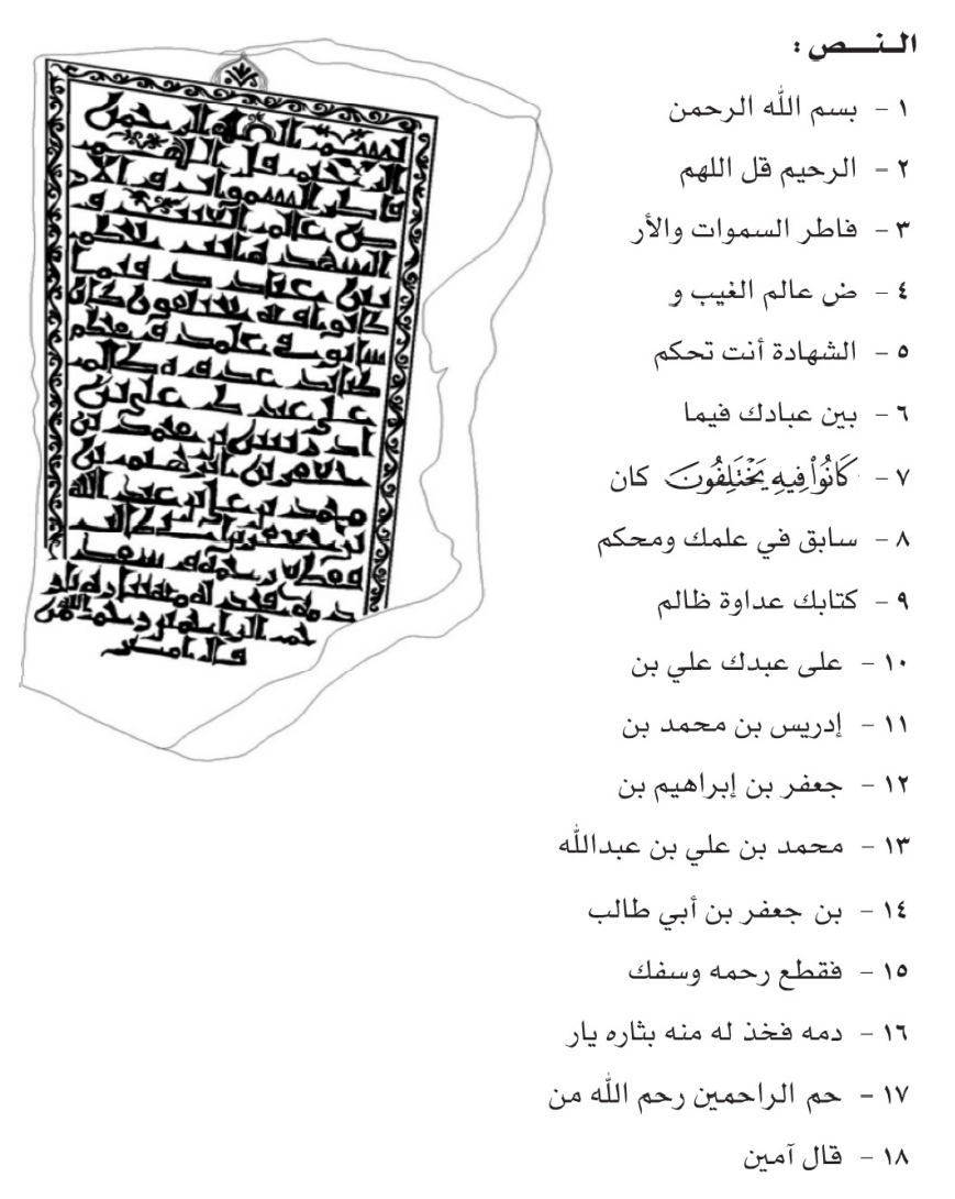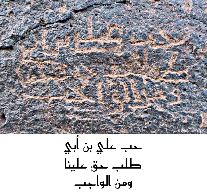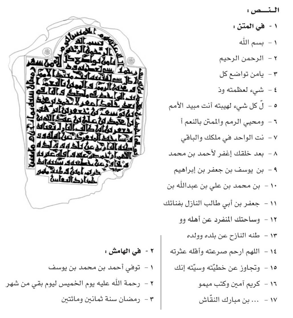 ويعود تاريخ هذا الشاهد إلى أواخر القرن الرابع الهجري وكُتِب عليه بالخطّ الكوفي (الغير منقوط ذى الزيادات المثلثة) النقش التالي: