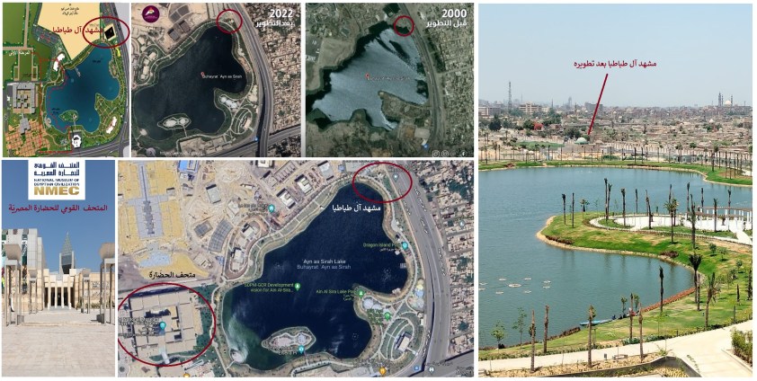 وتُشير الثقوب (في الصورة أعلاه) أنَ الجزء الخشبي كان مُثبّت على دعامة استُخدمت كمصراع أيْسَر لبوّابة المقبرة. وهذه صورة جويّة توضح موقع المشهد في الفسطاط: