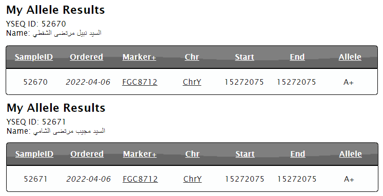 مواضيع مُتعلّقة: نتيجة WGS للسادة آل مرتضى الشقطي ، تحديث عيّنات السادة آل مرتضى الحُسيني ، نتيجة السادة آل مرتضى الشامي Y700 ، عيّنات السادة آل مرتضى وآل جمال الدين الحُسيني ، نتيجة السادة آل صبح BigY ، نتيجة السادة آل مكّة الحُسيني Y700 ، نتيجة السادة آل خلف العاملي Y700 ، نتيجة السادة آل نصرالله Y700 ، نتيجة السادة آل فائز الحُسيني WGS ، نتيجة السادة آل قفطون الحُسيني ، السادة آل فائز ، السادة آل طعمة وآل نصرالله ، تحديث نتائج السادة آل زهرة الحُسينيّين ، ستة نتائج لخط السادة آل زهرة ، تحديث نتائج النقباء آل زهرة الجعافرة ، عيّنات النقباء آل زهرة الإسحاقيين الجعافرة ، نتيجة آل موسى النقيب الزُهري الجعفري Y700 ، نتيجة آل حسّون صلاح الزُهري الجعفري Y700 ، نتيجة آل محي الدين الزُهري الجعفري Y700 ، عيّنة السادة الغرابان الحُسيني Y700 ، نتيجة السادة آل فريهيد Y700 ، نتيجة السادة الجميعان BigY ، نتيجة السادة الفويه الحُسيني Y700 ، نتيجة الفليجان والحرموس Y700 ، نتيجة السادة الصُليبي الحُسيني Y700 ، نتيجة السادة الكويم العيدي الحُسيني Y700 ، نتيجة السادة القبيه الحُسيني Y700 ، نتيجة آل النجعاوي BigY ، زهرة المقول وفروع بني حسين