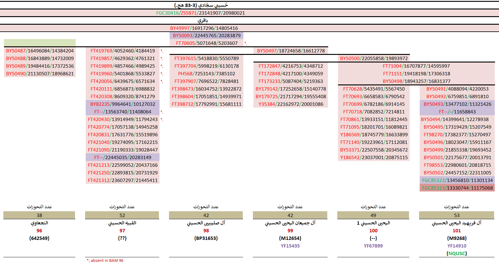 وهذا تذكير بمُشجّر هذه العيّنات الكريمة التي تحتاج جميعها إلى تطوير (Y700) حتى نقارنها مع باقي الفروع الحُسينيّة الجينيّة: