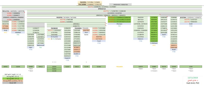 - تحتاج عيّنات آل الجلالي وآل شمس الدين اليحيوي إلى تطوير (فحص FGC28329 و FGC28335 و BY160110) لتأكيد أماكن التحوّرات اليحيويّة العُليا كما أوردناها في المُشجّر الجينو-تراثي.