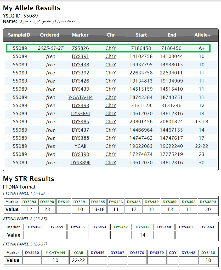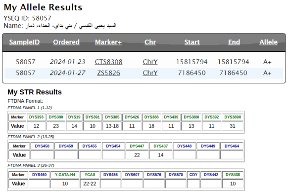 - موجبة لتحوّرين مُشتركين جديدين مع عيّنتيّ آل السيّد والمؤيّد (BY160110 و FTH65160)، ومطابقة لهم في تحوّراتها المُتكرّرة بفارق 3 من 67 STRs.