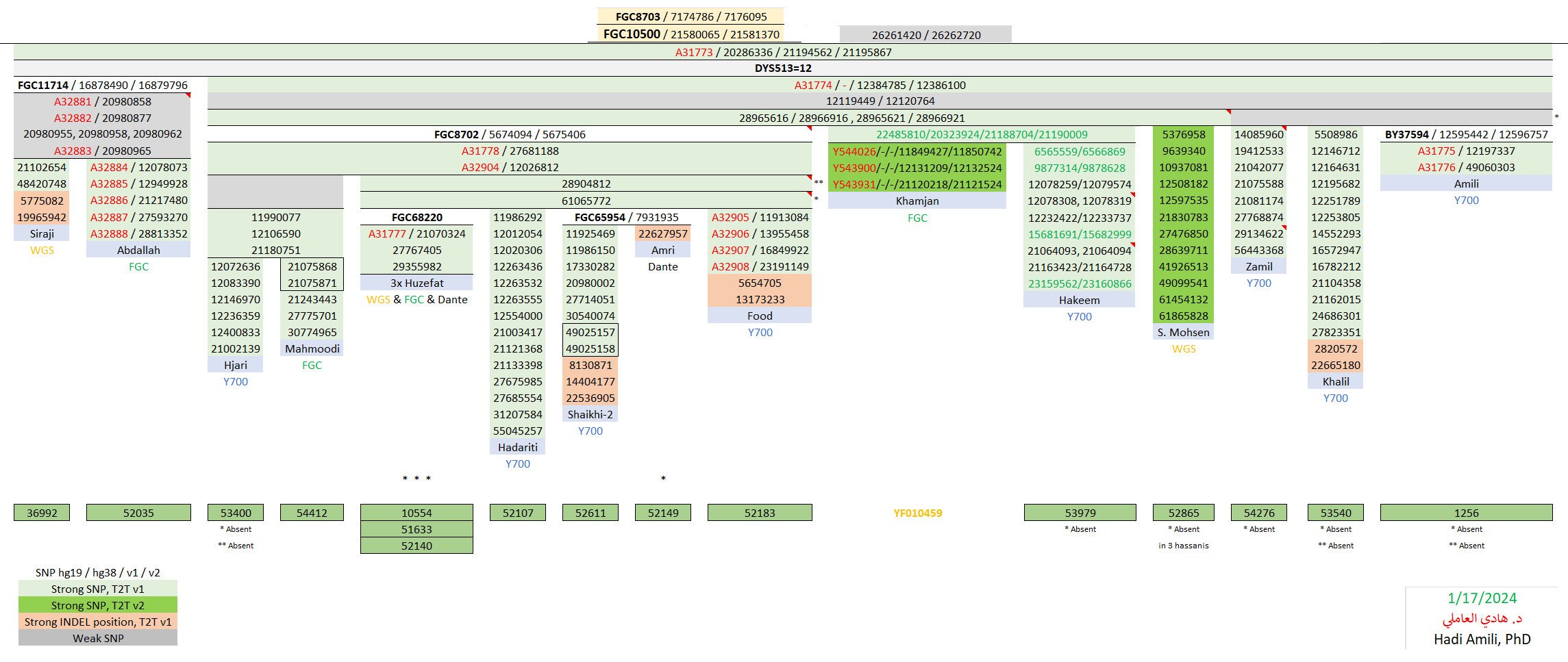 - مشجّر T2T الحسني: حيث اجتمعت عيّنات السادة آل الحكيم وآل خمجان وآل إمام بتحوّر جيني رسّي جامع Y586437.
