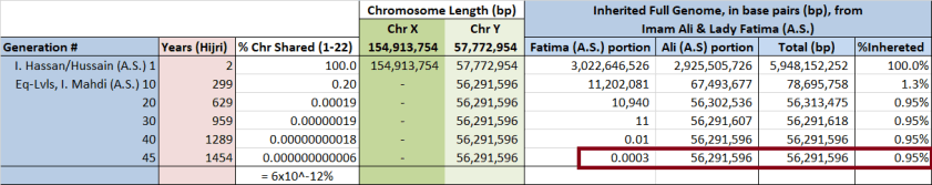 وبالخلاصة، يتبيّن أنّ العلويّين في أيّامنا هذه لا يحملون إلّا القُسم الثابت من ChrY في أجسامهم من أبيهم علي (ع)، والذي يصل إلى حوالي 56 مليون bp أو ما يُعادل 0.95% من مجموع الجينوم البشري العام لديهم. وكلّما زاد التزاوج داخل أُسَرهم العلويّة عبر العصور، كلّما عَلَت نِسبة bp segments من جينات أمّهم السيّدة فاطمة وأبيهم الإمام علي (ع) في أجسامهم، ولكنّها تبقى ضئيلة جدّاً. فالحمدلله على نعمة ChrY.