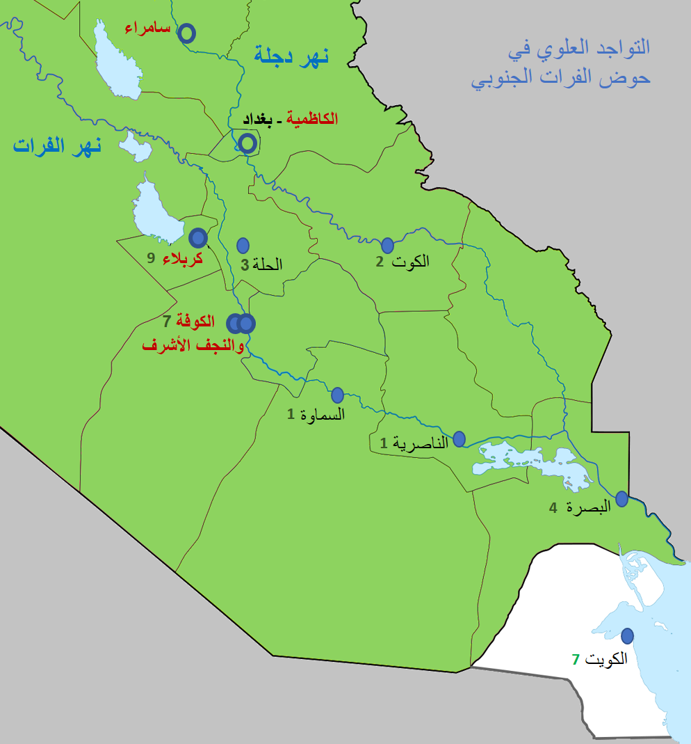 يُعتبر حوض نهر الفُرات الجنوبي الممتدّ بين مدينتي كربلاء شمالاً والبصرة جنوباً من أغنى الجغرافيا العلوية المُكتظّة بالسادة العلويّين والهاشميّين، اللذين ينحدرون من خطوط مُتعدّدة من ذريّة أمير المؤمنين (ع). وهذا ما أثبته توزيع مواطن أصحاب العيّنات (إلى يومنا هذا) والمُتكتّل معظمه حول مدينتي كربلاء والنجف الأشرف. ويتنوع نسب العلويّين هناك بين الحسني (المحضي والطباطبائي) والحُسيني (الموسوي والزيدي والأعرجي – بشقّيه الصالحي والمهانّي)، هذا بالإضافة إلى خطوط علوية وهاشميّة أُخرى لا زالت قيد التدقيق.