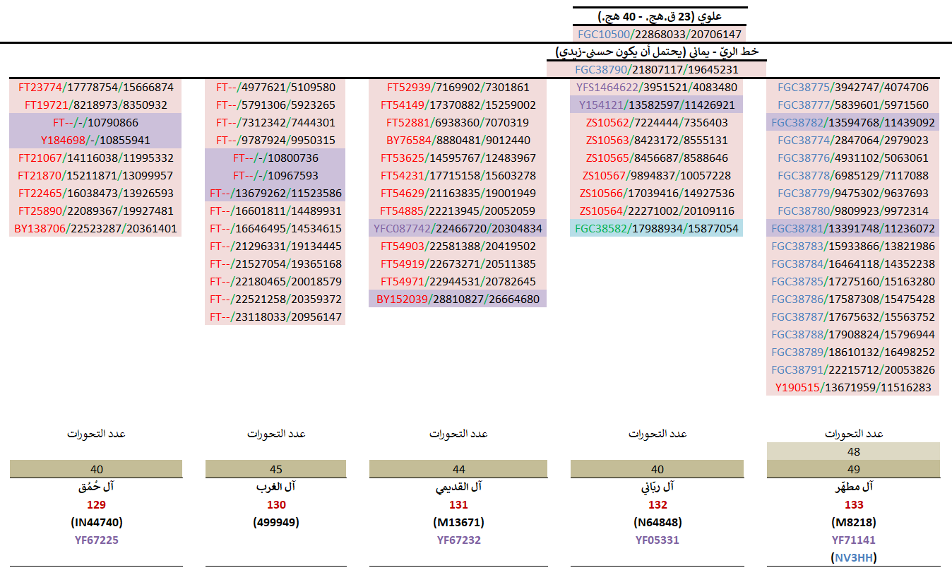 مواضيع مُتعلّقة: نتيجة السادة آل صائم الدهر BigY ، نتيجة السادة آل الغرب Y700 ، عيّنات عبّاسيّة جديدة Y700 ، تحديثات عديدة للخطّ العلوي-العبّاسي ، نتيجة السادة آل القاضي الأشموري Y700 ، نتيجة السادة القاضي الأشموري ، تحديث YFull لآل الهادي المطهر ، نتيجة آل داود حُمُق BigY ، تحديث نتيجتي آل رباني والمطهّر ، خطوط العلويّين العامّة