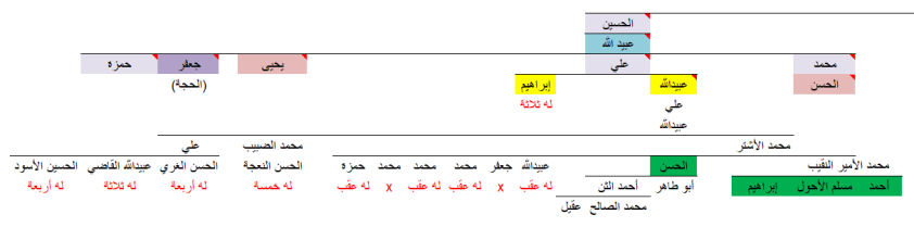وهذا مُشجّر يوضح فروع ذريّة عبيد الله الأعرج الخمسة التي عاشت وتكاثرت في القرن الخامس الهجري مضافاً له رؤيتنا لمواقع التحوّرات المُشتركة العُليا والعوائل المُتكتّلة تحتها في المشروع (من ذراري أمراء الكوفة ونقبائها ونقباء الموصل وأمراء المدينة من آل مهنا وقضاتها وعلماء الحلّة والحائر وبقيّة بادية بني حسين الأصغر):